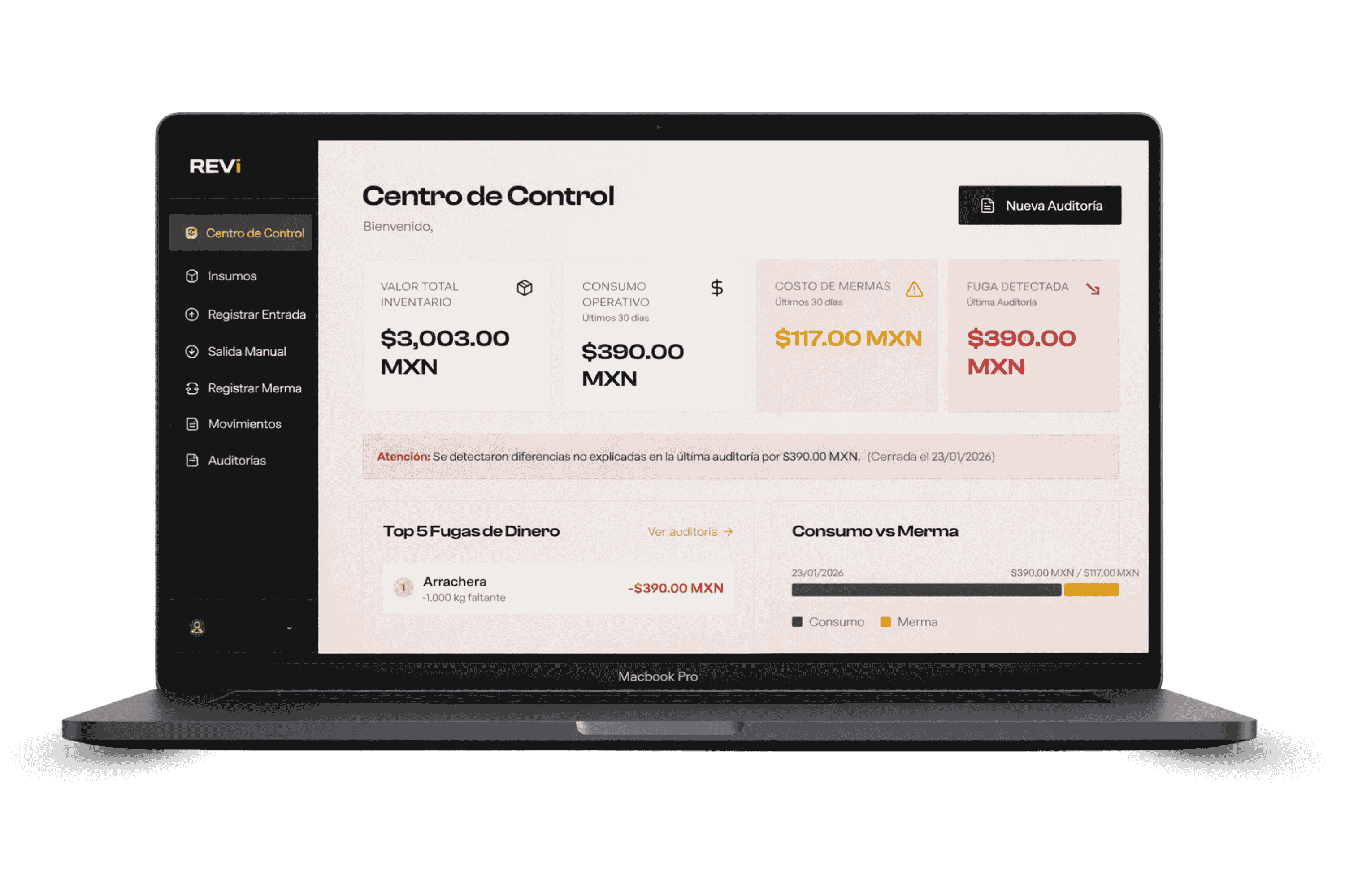 REVi es una app web diseñada para negocios gastronómicos en crecimiento que aún manejan su inventario de forma manual y quieren tomar decisiones con datos claros, sin ERPs ni sistemas complejos.